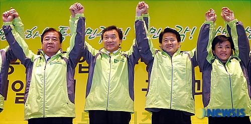 ★...통합민주당 손학규, 박상천 공동대표, 정동영 전 통일부장관, 강금실 공동선대위원장 등 지도부들이 23일 오후 서울 용산 백범기념관에서 열린 '제18대 총선 통합민주당 공천자 전진대회 및 민생제일주의 비전 국민과의 서약식'에서 손을 들어인사하고 있다. 【서울=뉴시스】 ▒▒☞[출처]경향신문