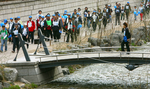 ★...21일 서울 청계천으로 현장학습을 나온 초등학생들이 돌다리를 건너며 즐거워하고 있다. 콘크리트 벽으로 막힌 도심에서 물이 흐르는 하천은 시민들에게는 소중한 휴식처다. 22일은 유엔이 정한 ‘세계 물의 날’이다. 캐논 EOS-1D MarkⅡN, 300mm 렌즈, ISO 400, 1/1000, f6.3 ▒▒☞[출처]동아일보 |