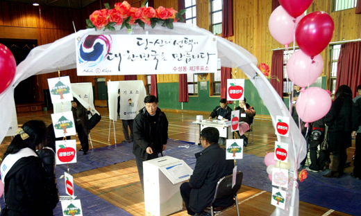 ▲ 제17대 대통령선거일인 19일 오전 서울 상도동 강남초등학교에서 한 유권자가 소중한 한표를 행사하고 있다.