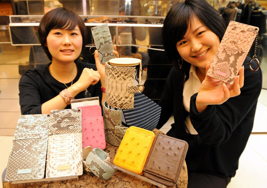 ▲ 19일 오전 서울 신세계백화점 본점 명품관내 생활용품 편집매장인 티오도에서 아나콘다 뱀피와 타조 가죽으로 만든 제품을 선보이고 있다. /뉴시스