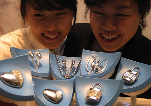 ▲ 현대백화점 압구정본점은 19일 은빛 금속 소재와 투명한 크리스털로 된 이어폰과 USB 메모리를 선보였다. 전자제품 제조사인 필립스와 보석 전문 브랜드 스와로브스키가 공동 제작한 이 상품으로 귀걸이, 목걸이 등의 액세서리를 착용한 듯한 느낌을 주는 것이 특징이다. /연합뉴스