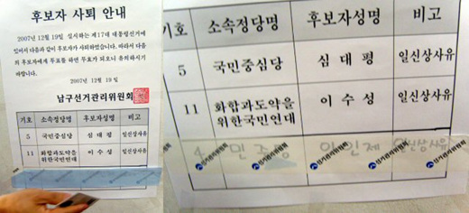 ▲ 민주당 이인제 후보가 사퇴했다는 안내문이 투표개시 이후 1시간여동안 인천의 한 투표소에 부착됐다가 나중에 잘못을 알게 된 선관위측이 안내문을 테이프로 가려놓았다. 그러나 테이프로 가렸어도 이인제 후보 이름이 확연히 드러나(오른쪽 사진) 민주당으로부터 강한 반발을 샀다. 선관위측은 착오로 빚어진 일이라고 해명했다. /민주당 제공 /