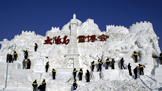 ▲ 18일 중국 헤이룽장성의 성도 하얼빈에서 눈조각가들이 거대한 눈조각을 마지막으로 손보고 있다. 이곳에서는 20일부터 '하얼빈에서 즐기는 이국적인 프랑스의 세계'를 주제로 제20회 하얼빈 태양도 눈조각예술박람회가 개최된다. /뉴시스
