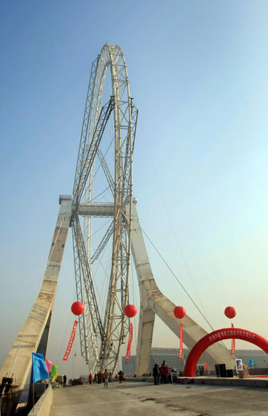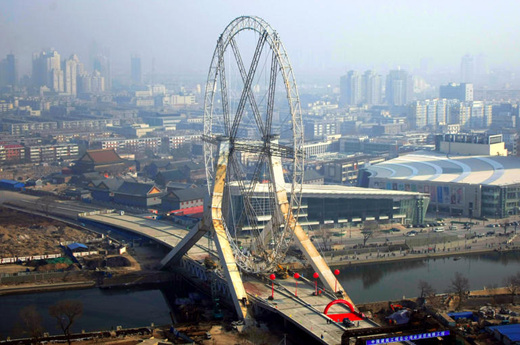 ▲ 중국 톈진에서 건설되고 있는 대관람차(스카이휠) '톈진의 눈'의 18일 촬영 모습. 톈진의 전경을 한 눈에 감상할 수 있는 직경 110m의 이 거대한 대관람차는 완공되면 한 번에 380명의 관람객을 태울 수 있다. /뉴시스