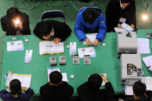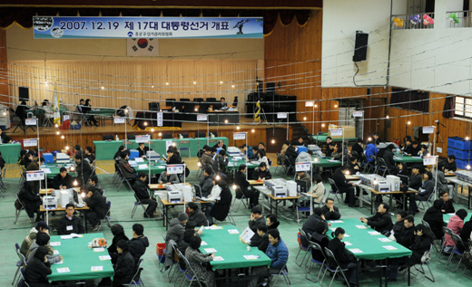 ▲ 19일 오후 제17대 대통령선거의 마감이 한시간여 남은 가운데 서울 종로구 청운동 경기상업고등학교 체육관에 마련된 개표소에서 개표 작업을 할 봉사자들이 마지막 점검을 하고 있다. /뉴시스