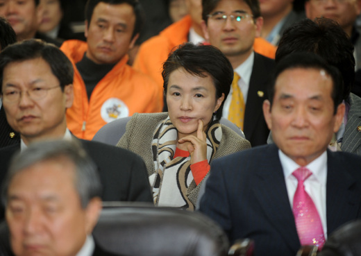 ▲ 제17대 대통령 선거 투표가 마감된 19일 오후 서울 영등포 당산동 대통합민주신당 중앙당사에서 정대철 총괄선대위원장 및 선대위원장들과 오충일대표, 김효석 원내대표 등 당지도부가 개표방송시청을 하고 있는 가운데 강금실 전 법무장관도 참석해 심난한 표정으로 방송을 시청하고 있다. /뉴시스