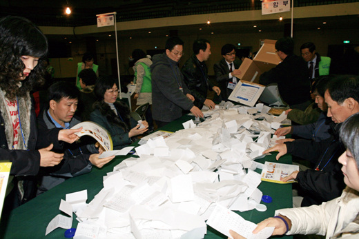 ▲ 제17대 대통령선거 투표용지 개표가 시작된 19일 오후 대전 동구지역 개표장이 마련된 동아공업고등학교 체육관에서 개표요원들이 개표함을 열고 있다. /뉴시스