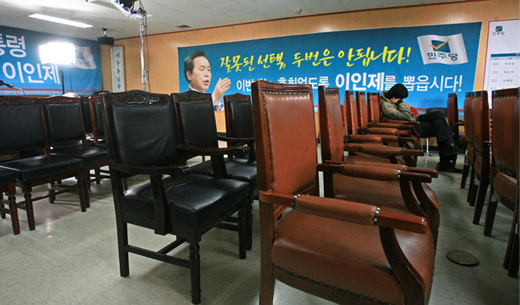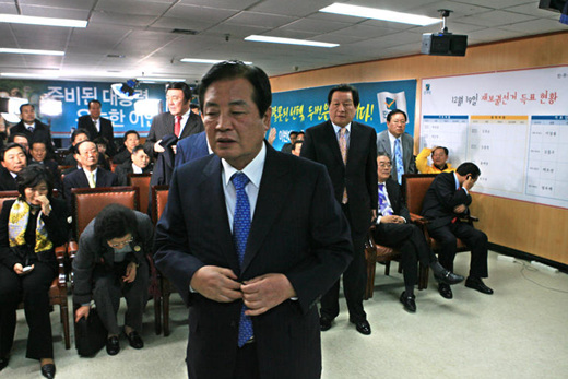 ▲ 19일 오후 출구조사 결과가 1% 미만으로 나타나자 민주당 박상천대표를 비롯한 당직자들이 대회의실을 떠나고 있다. /연합뉴스