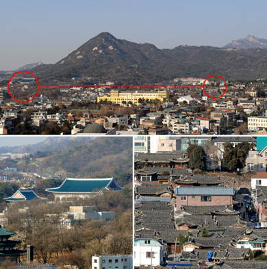 ▲ 17대 대통령을 뽑는 투표가 치러진 19일 오후 서울 경운동 뉴시스 통신사 옥상에서 바라보이는 북악산 자락의 대통령 집무실 청와대(왼쪽)와 이명박 후보의 가회동 자택이 지척인 거리를 두고 나란히 보인다. /뉴시스