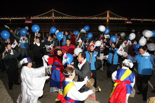 ▲ 19일 한나라당 이명박 대선후보가 당선이 확실시되자 부산 광안리해수욕장에서 이 후보 네티즌펜클럽인 사이버기동대119 회원과 지지자들이 이 후보의 대통령 당선을 축하하며 환호하고 있다. /연합뉴스