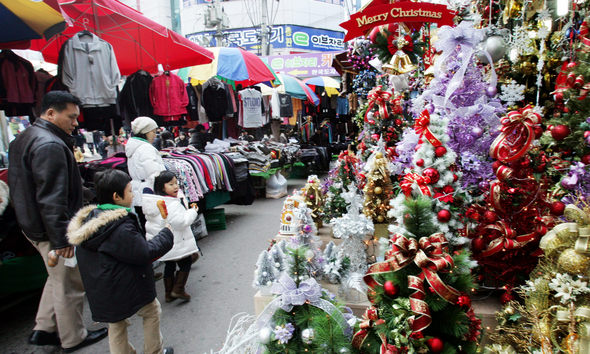 ▶ 크리스마스를 일주일 앞둔 19일 오전 서울 남대문시장을 찾은 한 가족이 크리스마스용 제품들을 살펴보고 있다. 김경호 기자