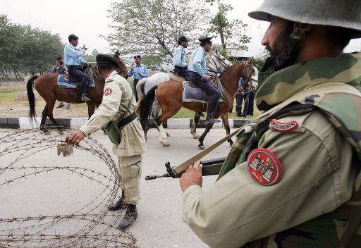 ▲ 파키스탄에 국가비상사태가 선포된 지 이틀째인 11월4일 수도 이슬라마바드의 대법원 부근에서 한 경비대가 기마경찰이 지나갈 수 있도록 철조망을 잠시 열어주고 있다. 이슬라마바드/AFP 연합