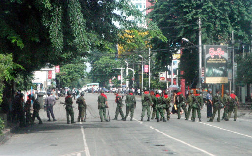 ▲ 미얀마 수도 양곤에서 9월29일 군인들이 시위대가 접근할 수 없도록 술레탑으로 가는 길목을 막고 있다. 양곤/AP 연합