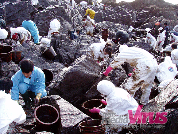 도착한 곳은 이전과 딴세상이었다. 바위색깔부터가 확연히 달랐다. 얼핏 보기에도 기름이 많이 묻어있는게 눈에 띌정도로 새까맸다. 또 바위가 산을 따라 쭉 드러선 해안가에는 사람들이 인간띠를 형성하고 원유가 담긴 양동이를 열심히 옮기고 있었다. 수천 명은 더 됨직한 그 줄을 따라 계속 들어가 보니 안쪽에서는 바가지와 쓰레받기, 맨손으로 바위 뜸뜸히 쌓인 원유를 퍼나르고 나머지는 통을 밖으로 전달하고 있었다.