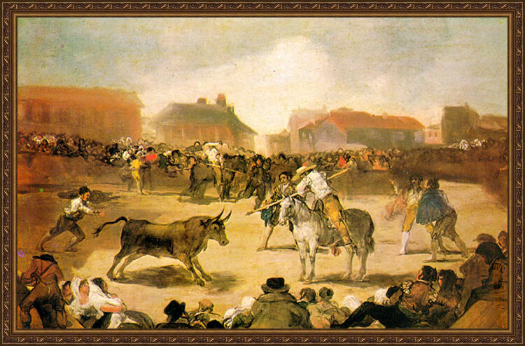 그림도 지방의 투우이며 귀족이나 농민이 지켜보는 가운데 피가돌(창으로 소를 찌르는 투우사)이 소에게 일격을 가하려는 순간을 그린 작품. 격렬하게