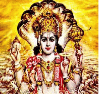 [그림] 보존의 신 "비쉬누", 그는 우주불멸의 힘 "쿤달리니"와 완전합일된 신성이다. 그림은 신성 비쉬누의 근원과 일치하는 "쿤달리니" 곧 "뱀"과의 근원적인 일치성을 상징하고 있다. 비쉬누는 쿤달리니 각성을 통해 도달해야 할 요기들의 완전한 목표이며, 역사 속에서 화신(크리슈나)하여 요가의 비의를 전수한 자로 신앙된다.
