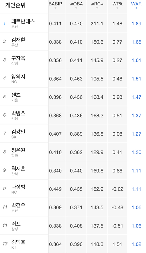 1위 페르난데스, 국내 1위 김재환*