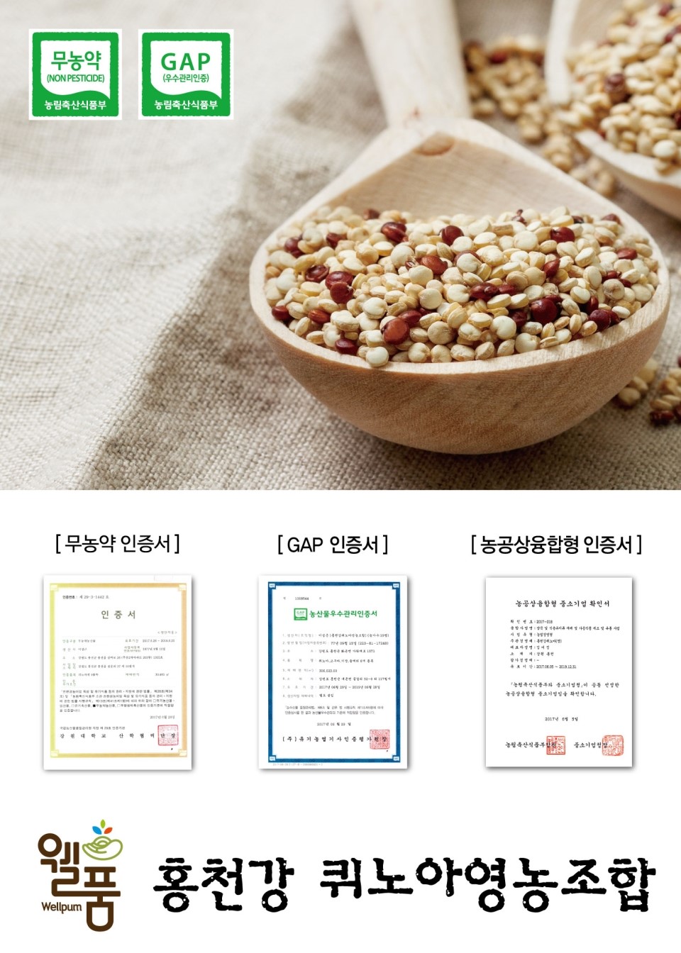 좋은 환경에서, 좋은 농민들이, 친환경 방식으로 재배한 잘 만들어진 농산물을 의미하는 웰품 홍천강퀴노아 입니다.