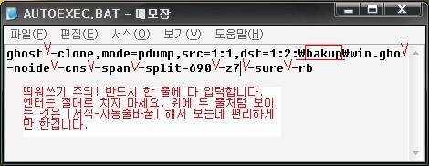 아래 autoexec.bat 의 내용을 보면, 두번째 파티션(대개 D드라이브)의 bakup 폴더에