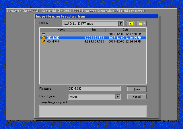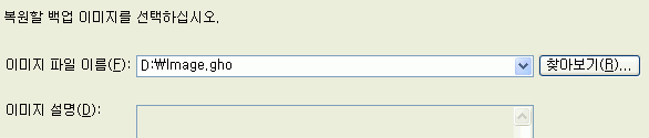 4. 콤보 버튼을 클릭하시어 고스트 백업 이미지가 있는 경로를 찾아가서 백업된 image.gho 파일을 선택하시고 다음 작업을 진행하십시오.
