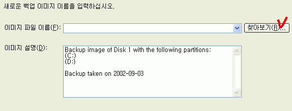 5. 백업하게될 드라이브를 찾아보기 버튼을 클릭하시어 선택하시고 이미지 파일 이름에 적당한 이름을 입력하세요 D:\를 선택해서 image를 입력하도록 하겠습니다.