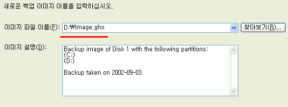6. 찾아보기 버튼을 클릭하여 저장하게될 경로를 편의상 D:\를 선택해서 image라는 고스트 백업 파일명을 입력하시게 되면 다음과 같이 이미자 파일 이름에 확장자자 붙여집니다..