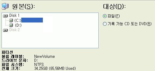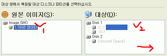 32. 원본 이미지를 선택하시고 대상에 복원할 지점을 선택하시면 됩니다. (윈도우의 복구 이므로 C:를 선택하시고 다음 작업을 진행하세요.
