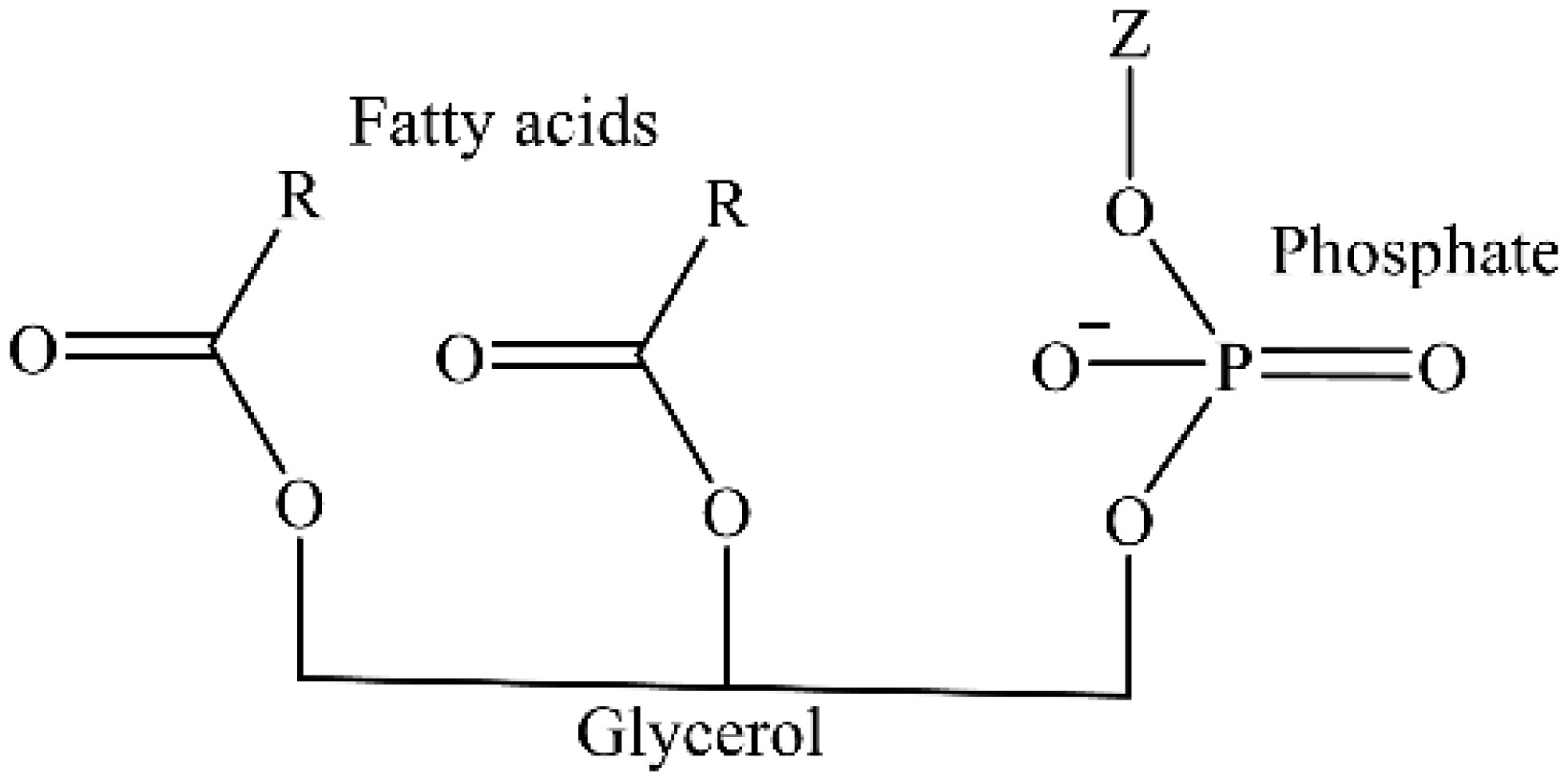 Figure 2. Schematic representation of lipid head group (Z) that act as a substituent to connect with glycerophospholipid.The hydroxyl cluster at the third carbon atom of the glycerol backbone is esterified to phosphoric functional group, which can be further esterified to the hydroxyl group of various alcohol moieties like ethanolamine, inositol, choline and serine. Phospholipids like phosphatidyl ethanolamine (PE), phosphatidylinositol (PI), phosphatidylcholine (PC), and phosphatidylserine (PS) are dominant in the cell membrane [36,37]. Sphingolipids consist of a long-chain amino alcohol, commonly trans-1,3-dihydroxy-2-amino-4-octadecene [38,39,40]. Depending on the diversity of head groups, sphingolipids are classified into three types—sphingomyelin, cerebro sulfatide, and cerebroside [41,42]. Phospholipids comprise polar head groups bound to ceramide or diacylglycerol. PLs are used as surface-active wetting agents and also as the coating agents on the surface of crystals to improve the hydrophilicity of hydrophobic drugs [28,43]. Ether phospholipid contains an alkyl group linked to oxygen atoms of glycerol. These alkyl groups present in phospholipids occur naturally in O-alkyl group [44]. Ether phospholipids contain an alkyl group linked to an oxygen atom of glycerol and are mostly present in plasma and nervous tissue [45].