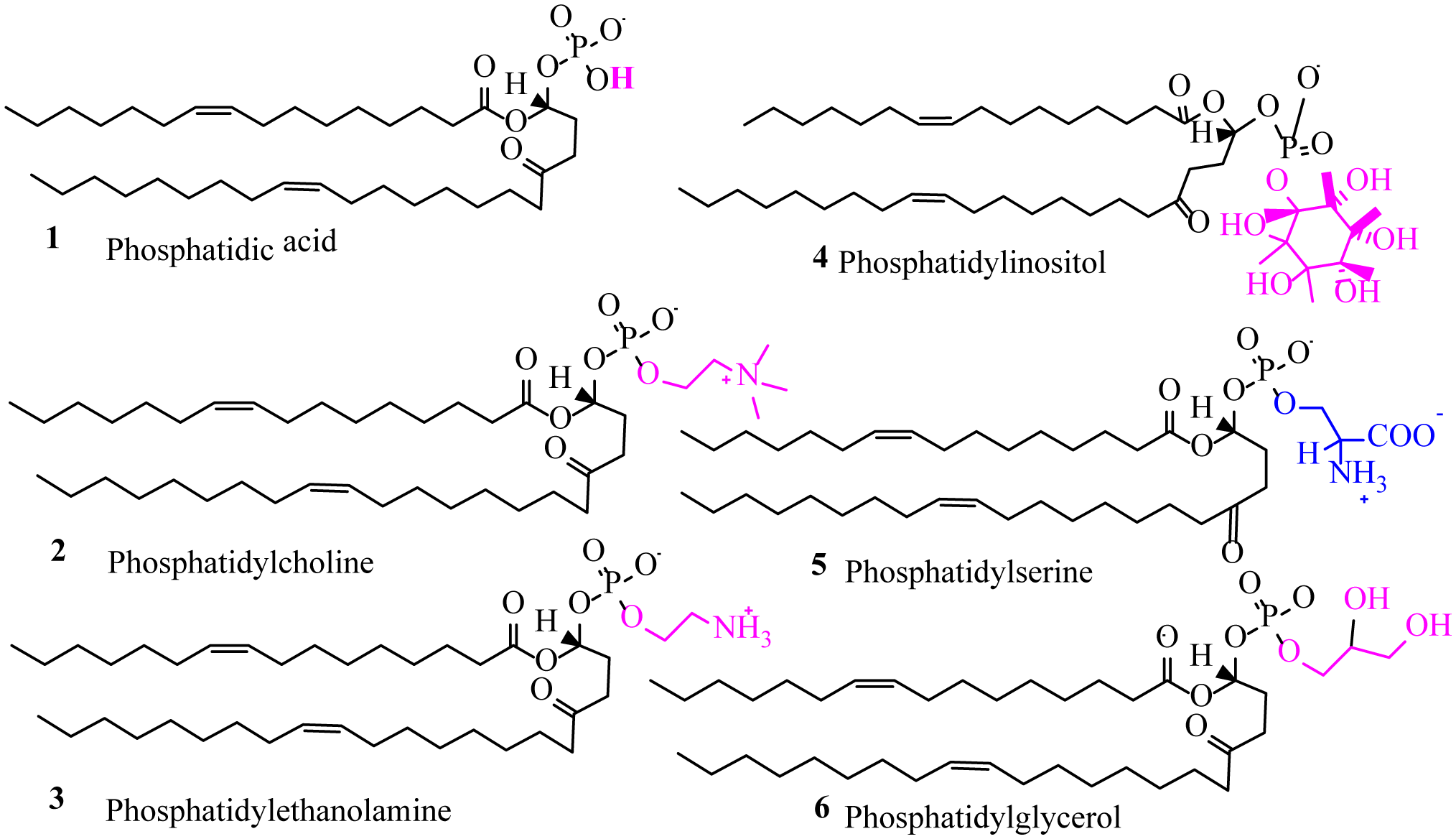 Figure 3. Functional groups and the name of phospholipids along with corresponding structures representing asymmetrical distribution of phospholipid generally found in the cytoplasmic layer.1. Phosphatidic acid; 2. Phosphatidylcholine; 3. Phosphatidylethanolamine; 4. Phosphatidylinositol; 5. Phosphatidylserine; 6. Phosphatidylglycerol.Asymmetrical circulation of phospholipids is generally found in the cytoplasmic layer (Figure 4). In typical cells, phospholipids are unevenly distributed in internal and external leaflets of the plasma membrane [46,47,48]. PC and sphingomyelin (SM) are present in the external leaflets, PS, and PE in the internal leaflets of the plasma membrane [49,50]. A number of studies have revealed that the PL asymmetry plays a significant role in the cellular and biological processes. Generally, PL asymmetry plays a role in subcellular distribution of proteins (e.g., apoptosis/fusion of organelle), preserve biophysical properties of particular membrane, maintain membrane trafficking/maturing/vehicle, support cell shape and alteration of PL asymmetry can also play prominent role in initiating biological processes, for example, blood coagulation, cytokinesis, cell fusion, identifying and discarding of apoptotic cells [51,52,53]. The PL asymmetry can have other essential cellular functions that are still to be found and analyzed. Membrane lipids in eukaryotic cells also show irregular distribution between subcellular organelles and between two membrane leaflets of specific organelles [54,55,56,57].