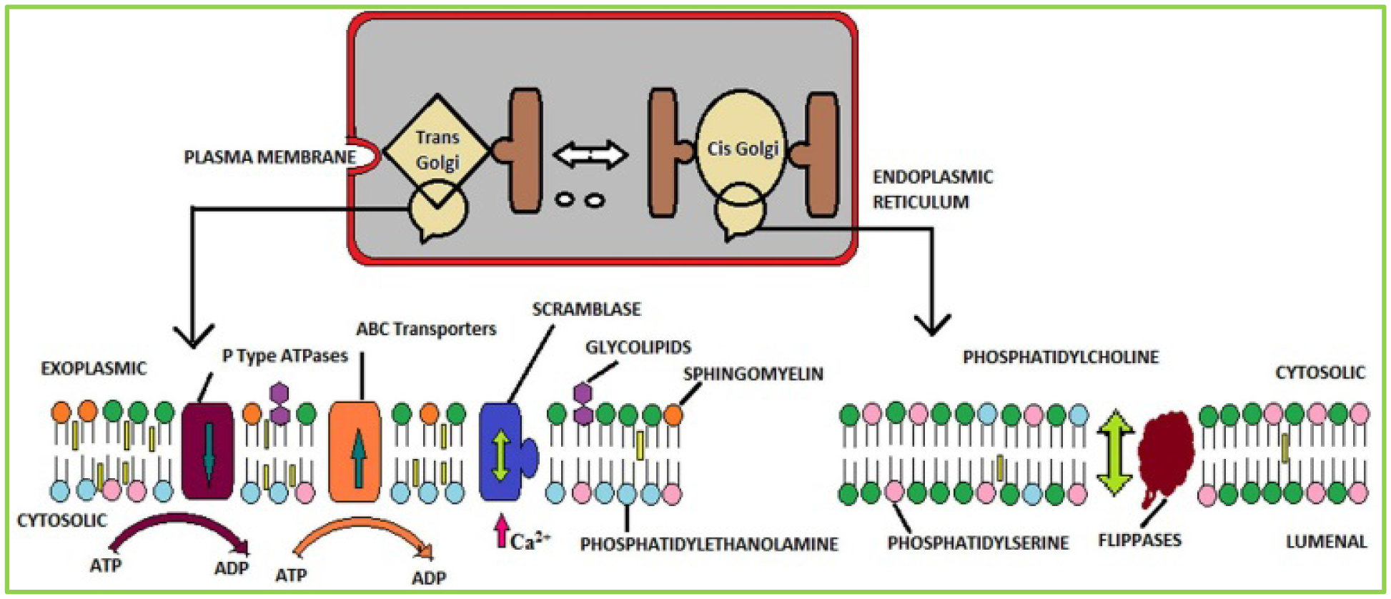 Flippases are transmembrane lipid transporter proteins found in the membrane which belong to ATP-binding cassette transporters (ABC transporters) family. Figure 4 explains about how flippases hydrolyze ATP to form asymmetric phospholipid distribution among the bilayer [58,59,60,61,62,63]. In endoplasmic reticulum, membrane proteins make it easier the instantaneous flip-flop of lipids and permit them to equilibrate between the two membrane leaflets not depending on ATP hydrolysis [64]. This method can aggregate given lipids in one leaflet, consequently causing an asymmetric lipid distribution over the layer. The characteristically dissimilar phospholipid arrangement of the two leaflets of a membrane bilayer is generated and maintained by bi-directional transport (flip-flop) of lipids between the leaflets [65]. Therefore, ATP-dependent flippases can preserve asymmetric lipid dispersion by moving particular lipid pumps (P-type ATPases/E1-E2 ATPases) towards or far from the cytosolic leaflet (ABC transporters). Cell apoptosis initiation activated by cytosolic calcium can break down the lipid asymmetry by the transient movement of an ATP-independent scramblase [1,2,66].