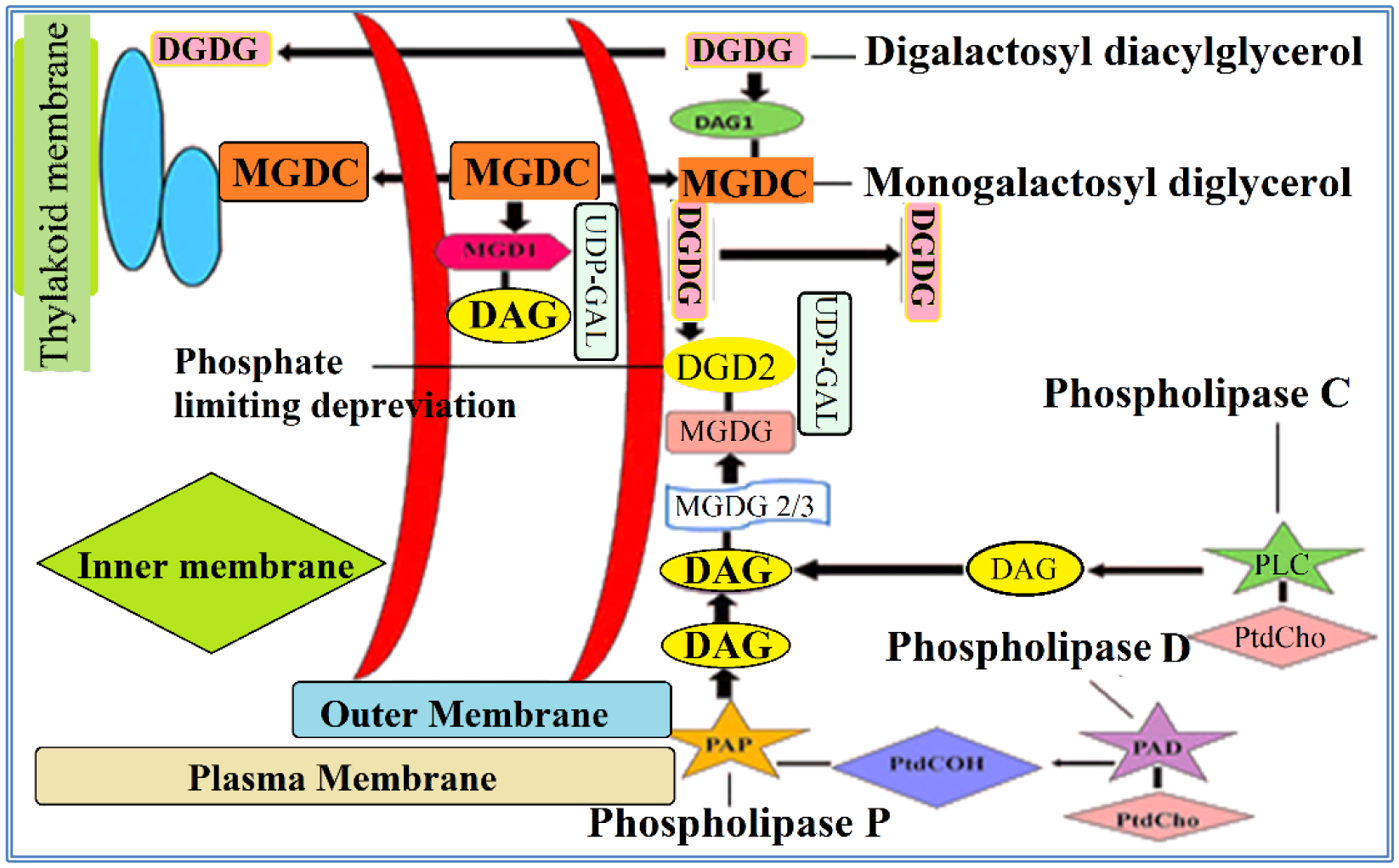 Figure 5. Lipid remodeling in response to phosphate limiting deprivation. Three areas shown are Thylakoid Membrane, inner membrane, and outer membrane. The dark red and blue Foundation highlights the principal pathway of galactoglycero-lipid biosynthesis intervened by UDP-Gal-subordinate galactosyltransferases MGD1 and DGD1 in Arabidopsis, which give galactoglycero-lipids to the thylakoid membrane. The yellow circle foundation (DGD2) demonstrates the phosphate limiting deprivation incited responses prompting the redesigning of layers in the cell. MGDC: Monogalactosyl diacylglycerol; DGDG: Digalactosyl diacylglycerol; DAG: Diacylglycerol.In the plant cell, phospholipids act as second messengers. PLs are generated due to stimuli through the activation of lipid kinase. These lipid kinases are involved in membrane docking proteins, which contain the suitable lipid-binding domain i.e., throughout the signaling of lipid, a protein downstream involved in signaling cascade can move from the cytosol to membrane sites [87]. By combining signaling protein at micro-location interaction is elevated and is helpful for activating further transmission of signals [88,89]. For example, a protein kinase could phosphorylate another kinase in the pathway or phospholipases could hydrolyze membrane lipids to deliver another round of lipid signaling. Signal transduction may inertly stimulate by expanding enzyme concentration at the docking sites yet the lipid can assume a more dynamic part by affecting a change in conformation that upgrades enzyme activity [90]. PL and their catabolites [91,92] induce the changes in physical properties of the membrane such as raising the rate of ion flux or else decreasing the amount of ion flux, vesicle development, and membrane transportation. The PL act as plant growth regulators. There is evidence that in plant development, individual phospholipids play a major role and the most prominent of them is phosphatidic acid stress lipid signaling [93,94].