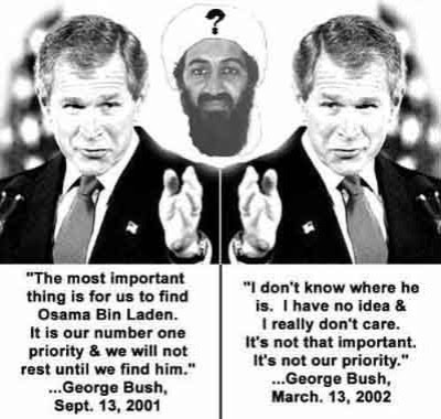 가장 중요한 일은 오사마빈라덴을 찾는 것이라 말했던 부시는 이듬해 봄, 어디있는지도 모르고 중요한게 아니라고 눙쳤다.