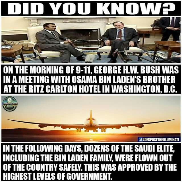 조지 부시 미국 대통령은 9.11 테러 직후, 빈 라덴 가족 모두를 워싱턴 DC의 리츠 칼튼 호텔에서 승리 축하 행사에 참석할 것이라고 믿는 사람들에게 재빨리 보냈다. 텍사스로 날아 와서 미국을 사우디 아라비아에 다시 남겨 두었다가 나중에 대담하게 말하면서 "2001 년 9 월 11 일에 아빠가 오사마 형제와 만났을 때 그를 테러 용의자로 만든다, "고 역설했다. 누구의 "아빠", 조지 HW 전 대통령이다. 그럼에도 불구하고 부시 대통령은 6 주 후인 2001 년 10 월 26 일 칼라일 그룹과 빈 라덴 가족 간의 모든 관계를 단절시켰고, 9.11 테러의 "주창자"로 알려진 CIA 요원 오사마 빈 라덴 후에 생각보다 별게 아닌게 되었다.