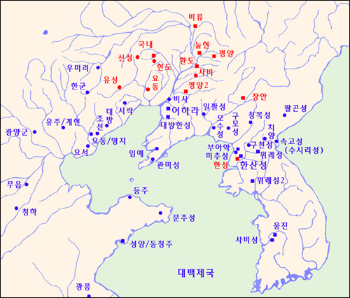 백제 온조대왕이 배를 타고 만주를 떠나와 한반도로 들어와서 처음 건국한 곳은 평안남도 대동강의 서쪽가지 보통강 평성시 청룡산성이며 대산한성, 하북 위례성이라 불렀고 이후에 대동강 동쪽가지 비류강 성천군에 하남위례성을 세웠다. 동서 2성인 것이다. 대동강 하류 평양에 있던 기준의 마한을 병탄하여, 백제가 북으로는 압록강, 동으로는 태백산맥, 남쪽으로는 금강에 이르렀다.