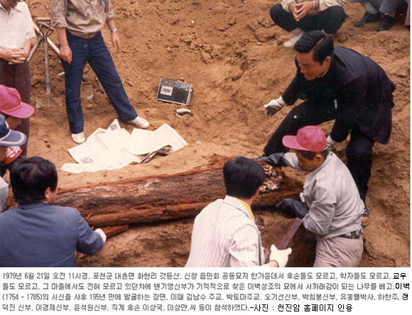 그러나 이장이 불가피하고 시급한 처지였으므로 이장 준비위원회를 꾸려 1979년 6월 21일 목요일에 주교들과 많은 신부, 수녀, 평신도들이 모인 가운데 묘를 발굴하니 “통덕랑 경주 이벽지묘”라는 지석이 한가운데서, "공인 안동권씨지묘"와 "공인해주정씨묘"라는 두 부인들의 지석 좌우편에서 나오고 그들의 유해가 완연하게 나왔다.