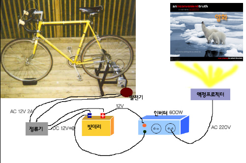 26인치 바퀴를 쓰는 자전거는 아무 것이나 올려놓고 페달을 돌리면 발전 할 수 있는 시스템을 생각했습니다.