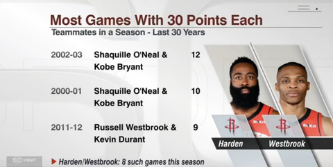 - 위 기준으로 하든과 러스 듀오는 2011-12시즌 KD - 러스 듀오의 9경기에 이어 4번째로 이번 시즌 8경기를 기록중.