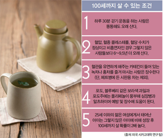 팁TV 끄고.. 100세 시대를 위한 10가지 팁 .. 의학의 발달로 평균수명 '100세 시대'의 도래가 멀지 않았다는 보고서들이 속속 이어지고 있다. 하지만 각종 질병으로 70세를 넘기지 못하고 사망하는 사람들도 적지않게 볼 수 있다.최근 한 연구에 의하면 흡연과 과도한 음주, 운동 안하기, 과일과 채소의 부족한 섭취 등 4가지 나쁜 행동은 12년 먼저 늙게 만든다고 했다.