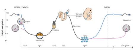 Due to the phenomenon of genomic imprinting, maternal and paternal genomes are differentially marked and must be properly reprogrammed every time they pass through the germline. Therefore, during gametogenesis, primordial germ cells must have their original biparental DNA methylation patterns erased and re-established based on the sex of the transmitting parent. After fertilization, the paternal and maternal genomes are once again demethylated and remethylated (except for differentially methylated regions associated with imprinted genes). This reprogramming is likely required for totipotency of the newly formed embryo and erasure of acquired epigenetic changes.[39]