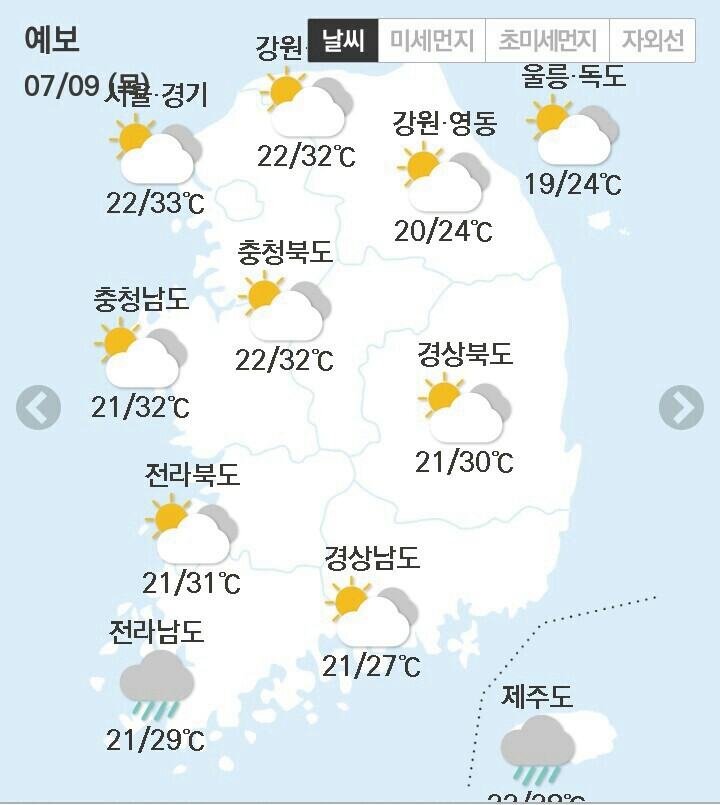 다음은 9일 지역별 날씨 전망.