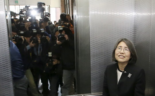 일명 '김영란 법'을 최초 입안한 김영란 전 국민권익위원장이 10일 기자회견을 마친 후, 엘리베이터에 타고 있다./뉴시스