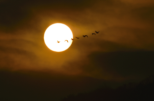 ▲... 정월 대보름. 연중 달이 가장 크고 밝게 보이는 대보름달 속으로 겨울 진객 큰기러기들이 고향으로 떠나고 있다. 음력 1월 15일이 지나야 비로소 한 해가 바뀌는 느낌은 아마도 우리에게 친숙한 기러기들이 겨우내 우리 곁에 있다가 고향으로 떠나는 시기이기 때문일지도 모른다.