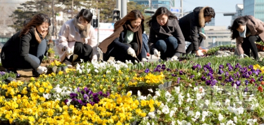 ▲... 꽃샘추위가 찾아온 4일 오전 서울 성동구 왕십리오거리 교통안전지대에서 성동구청 직원들이 꽃을 심고 있다. 박지환 기자