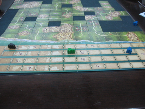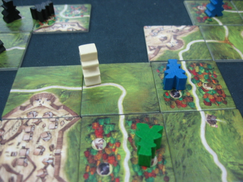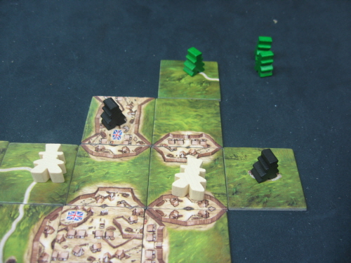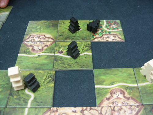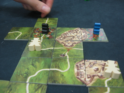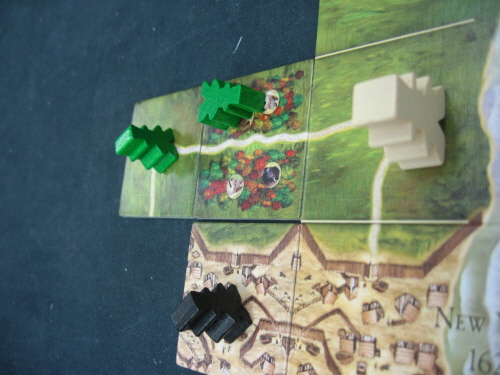 마을을 연결해 감독관이 한칸 전진한 모습입니다. 한칸 더 전진하면 검은색 말이 길을 연결하기