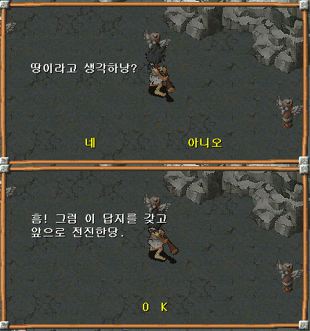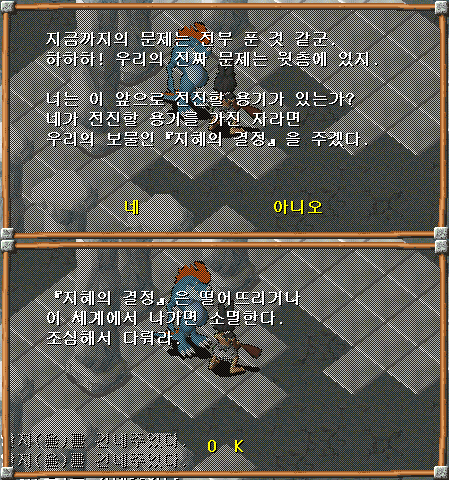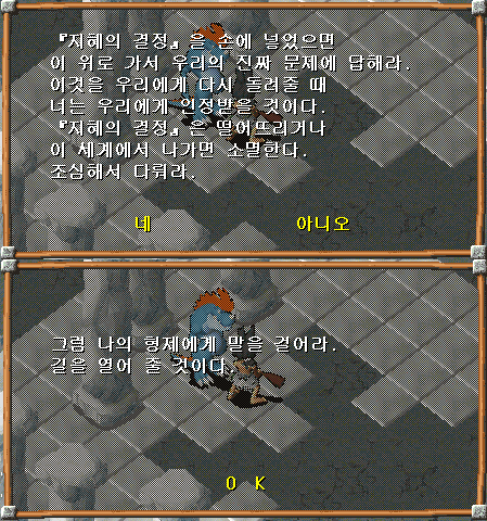 3. 5층에서 모든 정답지를 들고 중앙의 기로스(얀기로의 모습)와 대화하여 지식의 결정체를 얻은 뒤에 다시한번 더 대화한 뒤에, 앞으로 더 전진해서 후루도(부르돈의 모습)와 대화하여 6층으로 이동합니다.