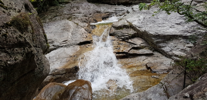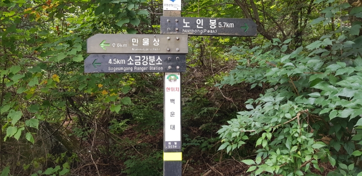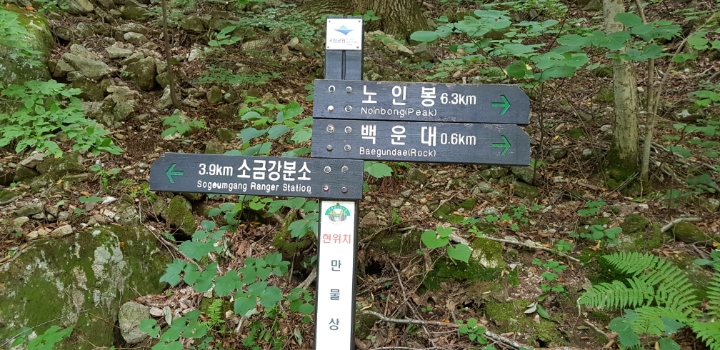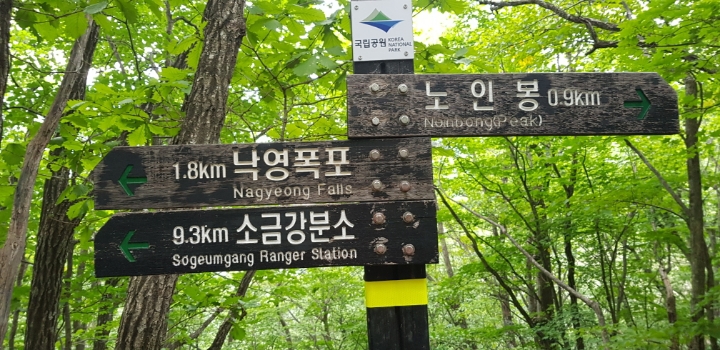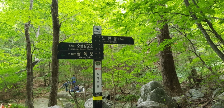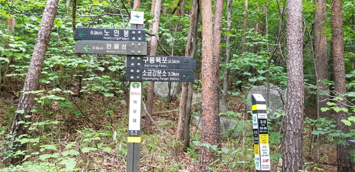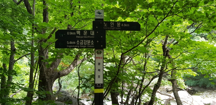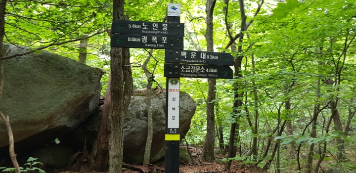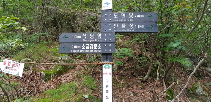 진고개 - 노인봉 - 낙영폭포 - 굉폭포 - 삼폭포 - 백운대 - 선녀탕 - 만물상 - 구룡폭포 - 삼선암 - 식당암 - 연화담 -십자소 - 금강사 - 무룡계 - 소금강분소 - 주차장(약 16km 산행)