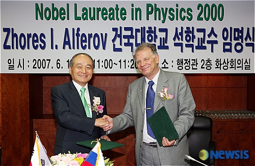건국대학교(총장: 오명)는 노벨화학상 수상자인 미국 스탠퍼드대 로저 콘버그 교수를 석학교수로 초빙한 데 이어 노벨물리학상 수상자인 조레스 알표로프(77·사진) 러시아 상트페테르부르크 과학센터(SPSC) 센터장을 석학교수로 영입했다.