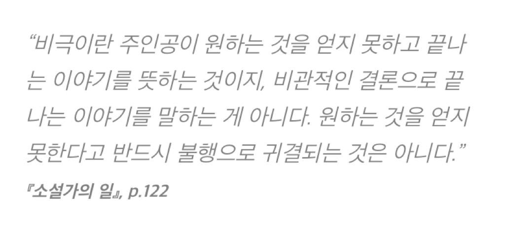 그러니까 실패가 결코 다 실패는 아니다. 우리가 소설 속 주인공이라면, 원하는 것을 얻지 못하고 끝나는 모든 이야기가 새드 엔딩은 아닌 것처럼. 그런 소설은 항상 주인공의 마음이 이야기의 시작과 달리 성장한 것을 보여주며 끝난다. 책 『소설가의 일』에는 이런 문장이 나온다.