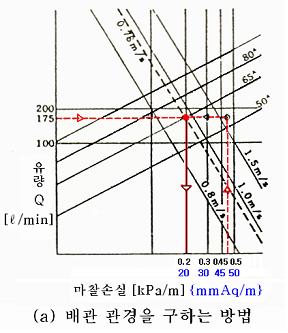 그림 2.44(a)에서 두 값의 교차점은 65[A]와 50[A]의 중간이 되나 허용마찰손실수두가 0.45[kPa/m]{45mmAq/m}보다 작아야 하므로 65[A]를 택한다. 이때 유속은 0.88[m/sec]이고 실제 마찰저항은 0.2[kPa/m]{20mmAq/m}이다.