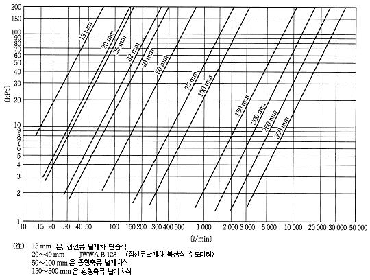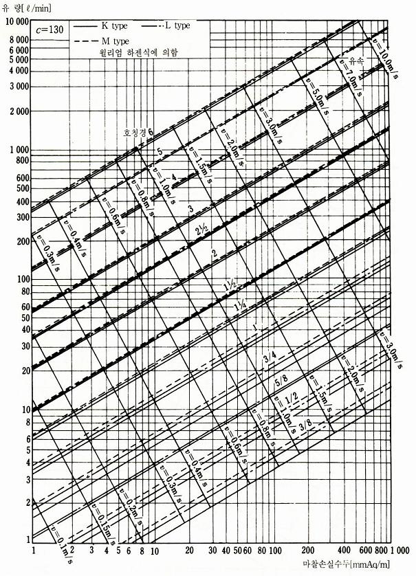 그림 2.36~2.41은 각종 배관의 유량선도이다. 실험식에 의한 유량공식은 이 외에도 웨스턴공식, 이케다공식, TW 실험식 등이 있다.
